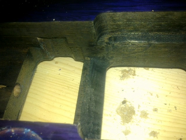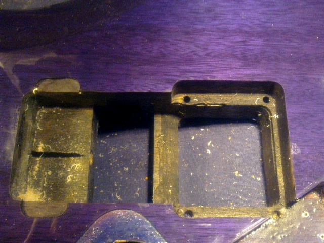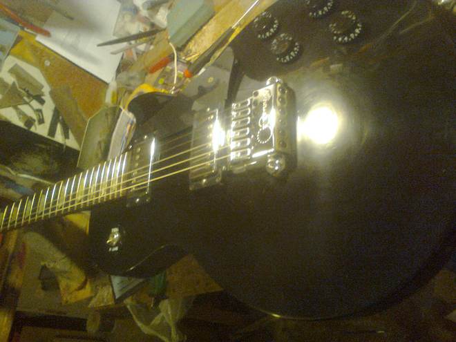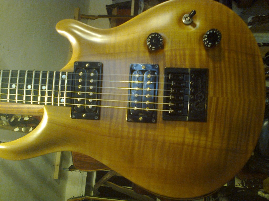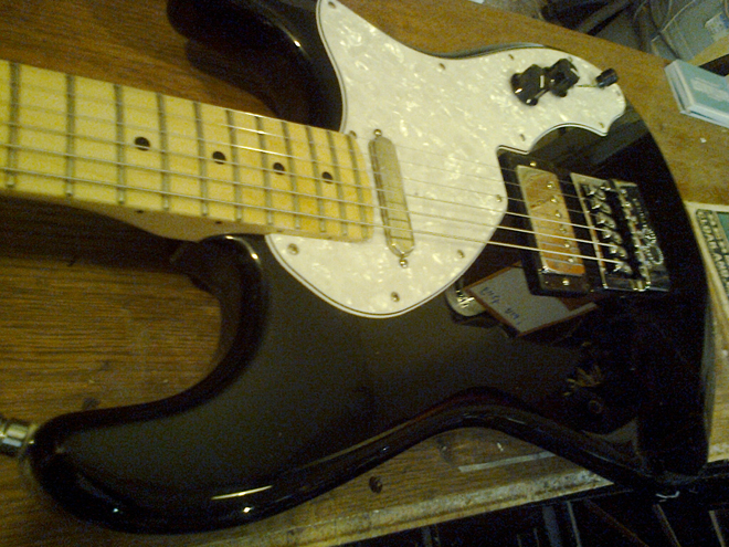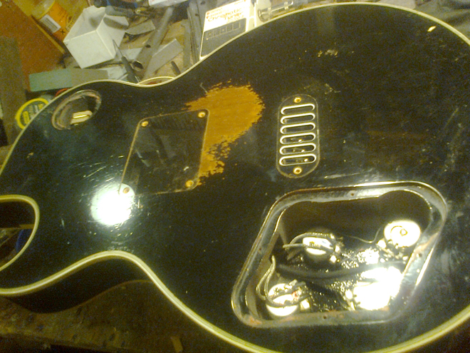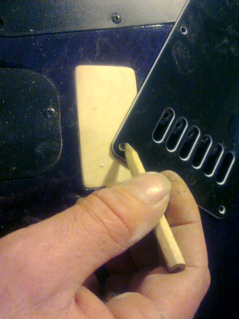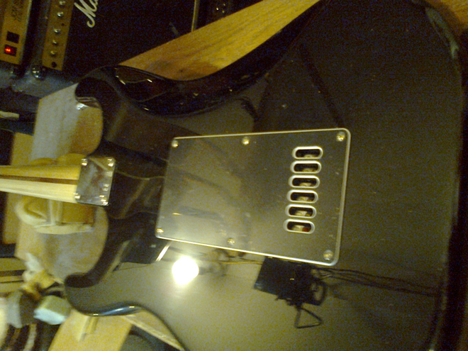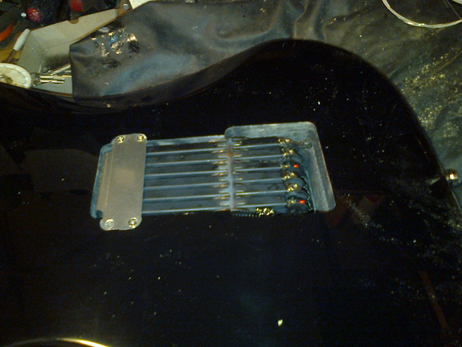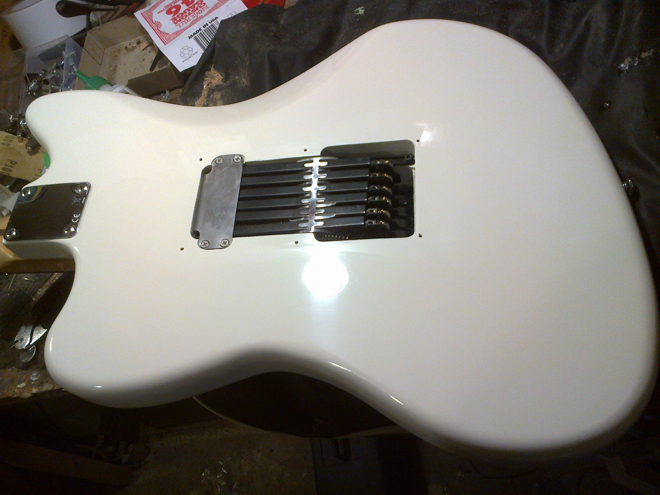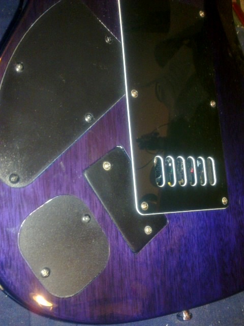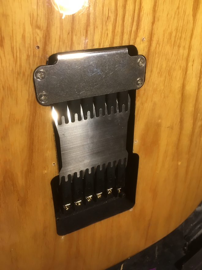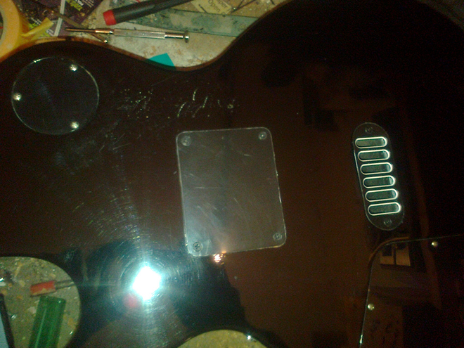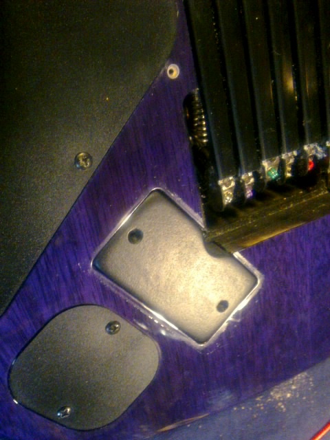 On this particular guitar there was a redundant battery cavity from when the guitar used active pickups. I filled the space with a piece of maple painted black to match the plastic cover plates and added screws to match their appearance.