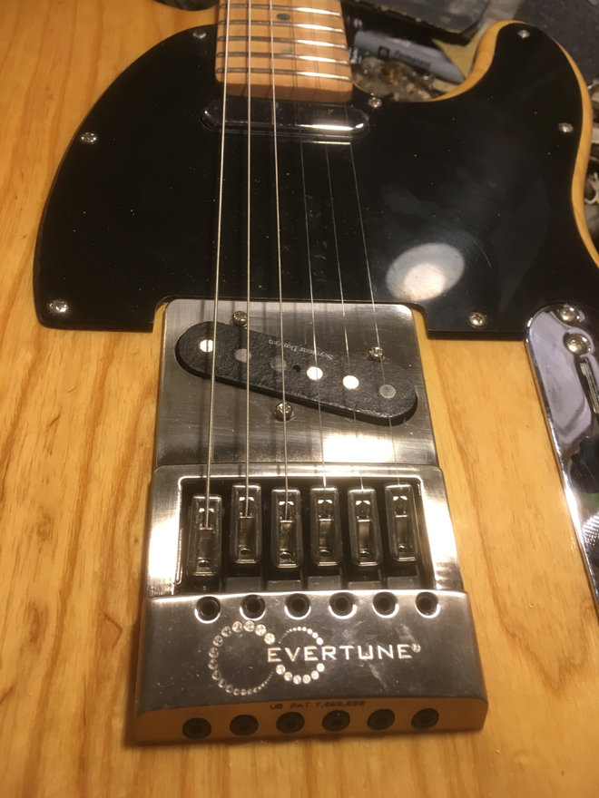 New from EverTune, brushed nickel bridge. EverTune now do their bridges in brushed nickel, perfect for vintage and classic style guitars. We recently fitted one to this Telecaster: